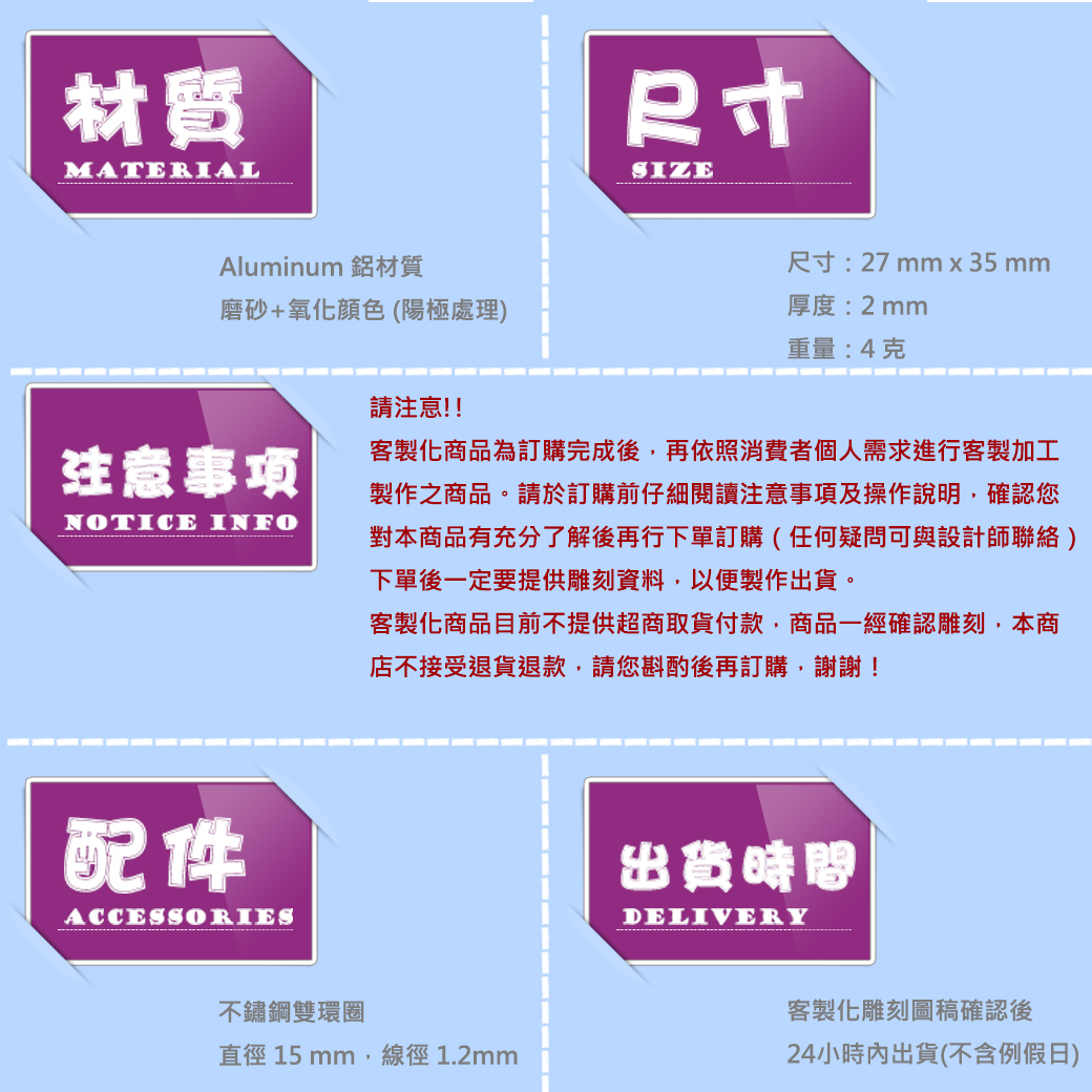客製化商品一經雕刻,不能修改,也不接受退貨退款,請您考慮清楚後再訂購,謝謝!