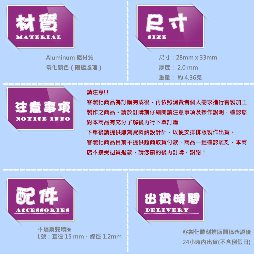 客製化商品一經雕刻,不能修改,也不接受退貨退款,請您考慮清楚後再訂購,謝謝!